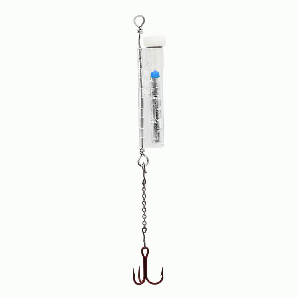 The FishDaddy Jig-Flare Dropper Spoon combines the time-tested fishing tactic of deadsticking with an Stick Flare LED that will glow for up to 24 hours. Turn on the high-quality Stick Flare LED by pulling the head gently upward until it blinks/glows, and then place it into the clear polycarbonate housing and replace the cap. Tip your favorite bait onto the VMC treble hook, drop it into the water, and get ready to pull 'em up!